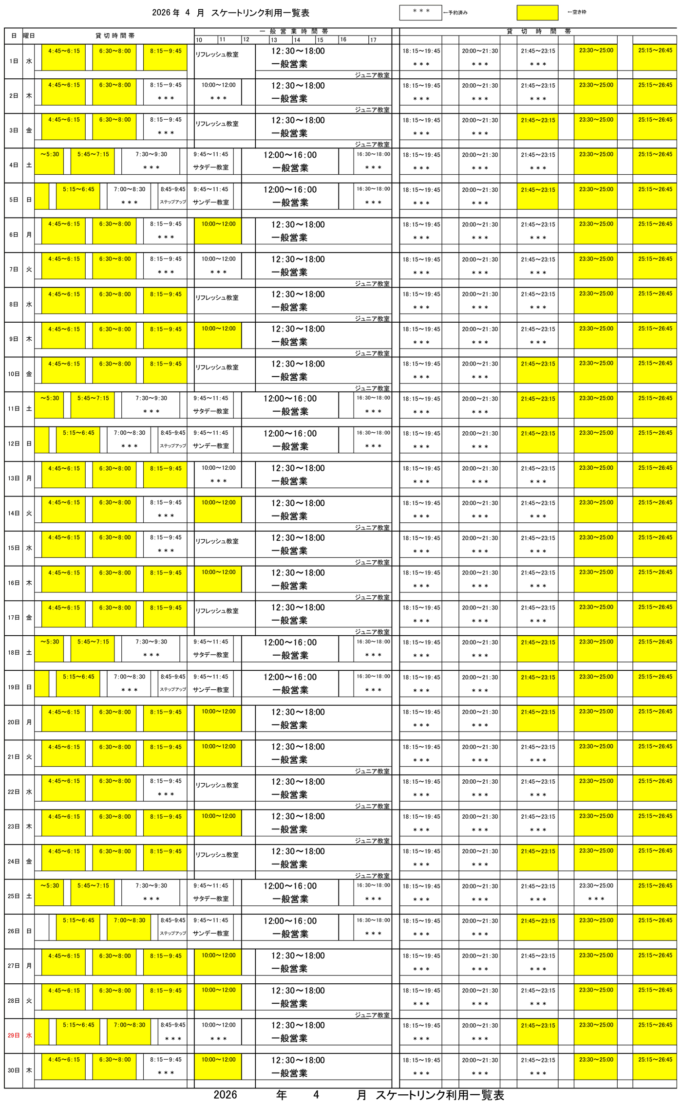 競技(貸切) 専用使用(貸切)のご案内 貸切カレンダー 2月 3月 4月 ダウンロード(PDF) ダウンロード(PDF) ダウンロード(PDF) 貸切利用申込書ダウンロード 貸切利用申込書(PDF) 貸切利用申込書(Excel) 専用(貸切)利用料金 メインリンク30分11,000円90分33,000円ホッケーゴール/枠2,000円ホッケータイマー/枠2,000円ショートトラックマット/枠2,000円電光掲示板/1試合2,000円放送設備/枠2,000円電源/口100円 お申込み方法 貸切使用要領をご確認の上、下記のお電話にてお申込み下さい。 貸切使用要領(PDF) お電話 0798-41-3898 受付時間:10~18時(土日祝も可)